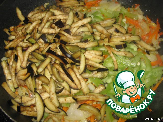 Также соломкой нарезанный баклажан и болгарский перец. Обжариваем всё вместе минуты 3.