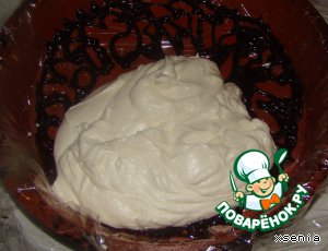 Когда сливки застыли .Достаем из формы .Переворачиваем на торт и аккуратно снимаем пленку