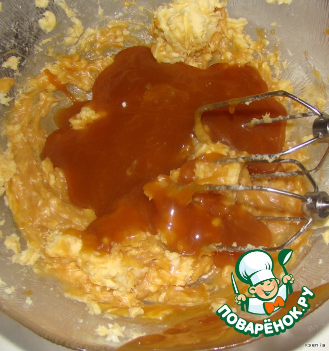 [ Размягченное масло взбиваем постепенно добавляем в него карамель Продолжая взбивать.