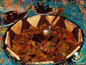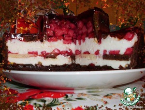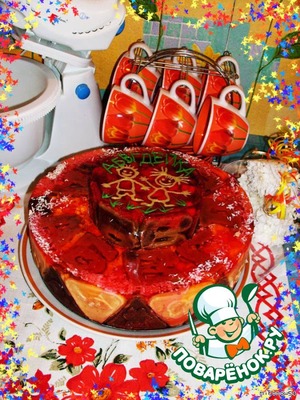 Укладываем на дно разъемной формы запеченный круглый корж из темного теста, выкладываем на него цукаты, в которые предварительно добавили 6-8 столовых ложек растворенного желатина и мелко порезанных свежих или консервированных ананасов. Хорошенько промачиваем нижний корж медовым наваром от цукатов и выкладываем, как видно на фото, из треугольных печений бока торта.