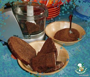 Тесто для коржей и остальных деталей торта я готовлю не совсем обычным способом… Никогда не применяю всяких разрыхлителей и пищевых добавок. Ставлю опару на стакане теплого молока, 2 стакана муки, 4 ложки сахара, 50 грамм натуральных пекарских дрожжей, даю настояться в теплом месте пару часов. Для темных коржей, заранее покупаем булку черного ржаного хлеба, режем на тонкие дольки, высушиваем сухари, сухие сухари слегка подрумянить в духовке и перемолоть в мелкую сухарную крошку.