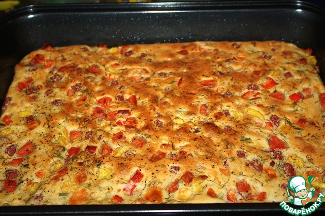 Теперь все перемешиваем, добавляем петрушку и сбрызгиваем оливковым маслом. Выкладываем овощную смесь в тесто.