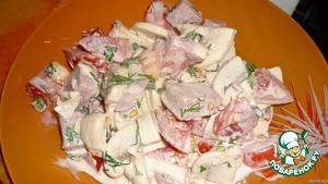 Данный салат готовится очень быстро, имеет пикантный вкус. Поначалу меня смутило, что в салате используются свежие неприготовленные шампиньоны - я-то всегда была уверена, что свежими грибами только травятся. Но оказалось, что они вкусные и совершенно съедобные! Прошу к столу!