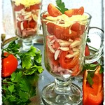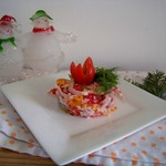 Очень вкусный и красивый салатик, несложный и быстрый в приготовлении. Все ингредиенты не надо заранее варить или жарить. Просто достать из холодильника, нарезать и заправить майонезом или каким-либо другим соусом.