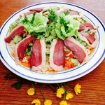 Из капусты берем мягкие листочки и режем на небольшие полоски, которые начинаем сворачивать с разных сторон. Укладываем на салат и добавляем листики мяты.