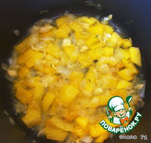 Добавляем кубики тыквы, тимьян, солим, накрываем крышкой и тушим всё на медленном огне 10-15 минут (пока тыква не станет мягкой).