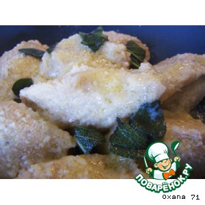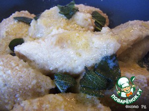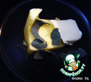 Пока наши ньёки варятся, в небольшой посуде (я использую обыкновенный ковшик) растапливаем сливочное масло с шалфеем (можно не резать листики, а просто порвать) до прозрачного состояния.