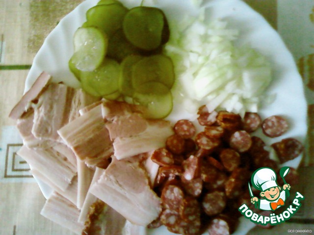 Пока тесто поднимается, нарезать начинку: Колбаски колечками, грудинку тонкими ломтиками. Можно даже купить уже нарезанную, т.к. чем тоньше, тем лучше.