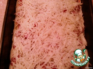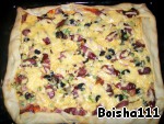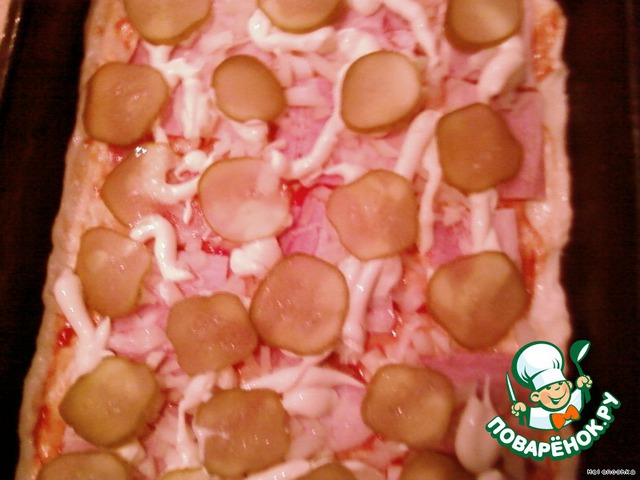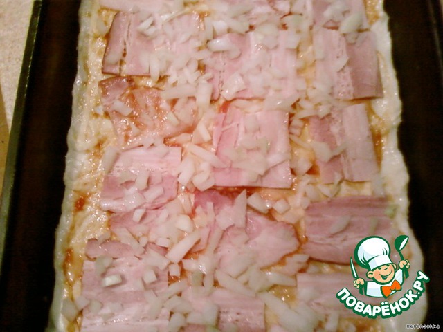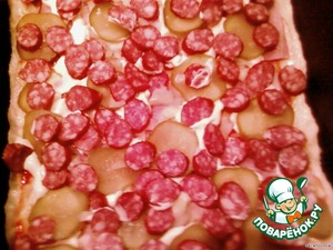 Тесто распределить по форме пальцами (как можно тоньше) и смазать кетчупом или томатной пастой. Далее слоями: