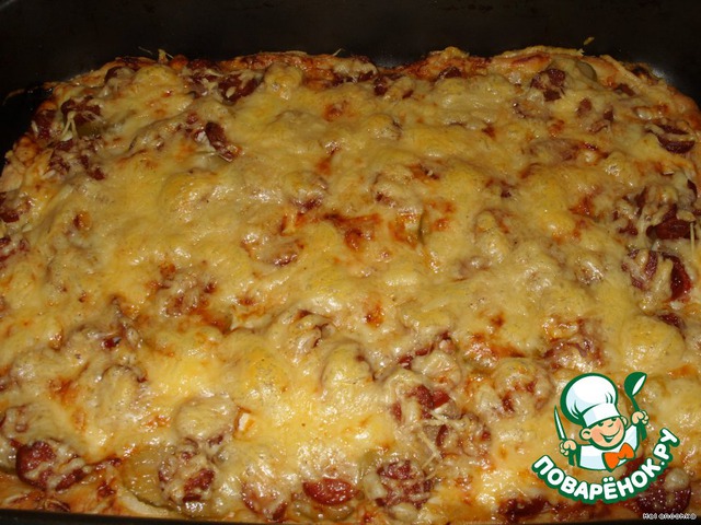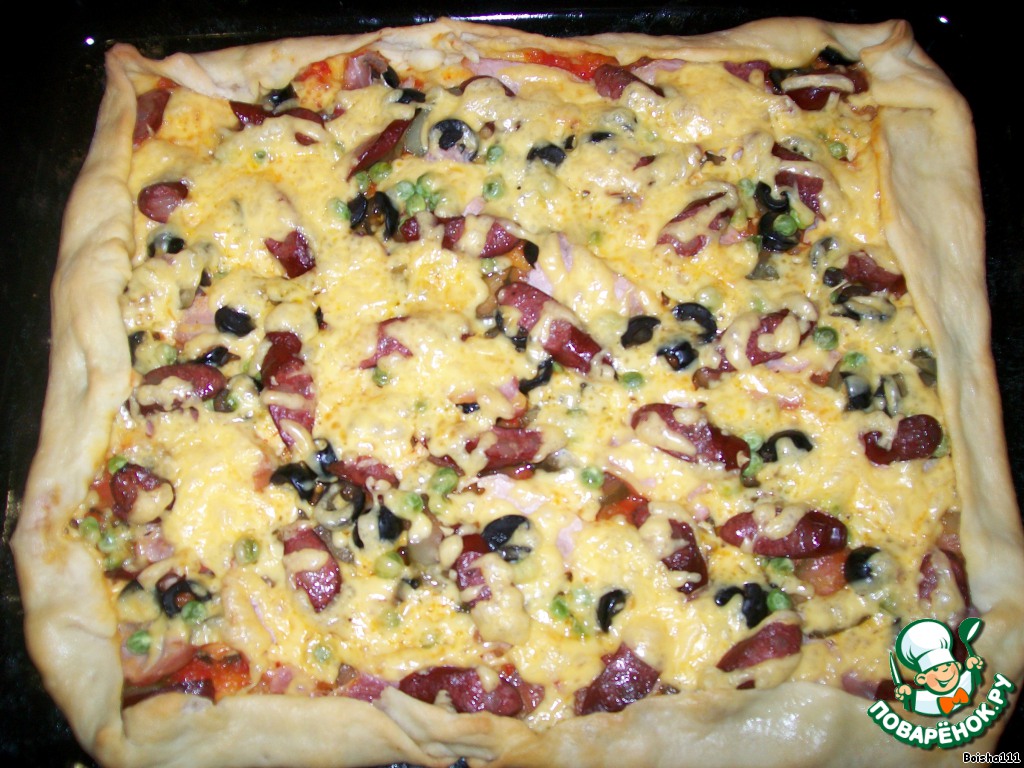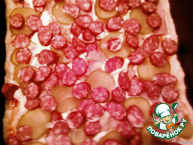 Решила поделиться не рецептом теста для пиццы, а начинкой! Это очень вкусно. Первый раз заказали пиццу и выбрали именно эту. А так как заказывали ее преимущественно вечером в выходные, то нам ее просто не возили... говорили, что у них много заказов и так далеко они не повезут (хотя мы живем в городе, но в довольно отдаленном районе). Пришлось самой разобраться с начинкой, теперь готовлю и с удовольствием! Особенно оценят мужчины. Так порадуем наших мужчин!! За рецепт теста спасибо Фрау Марта. Отличный рецепт дрожжевого теста)))
