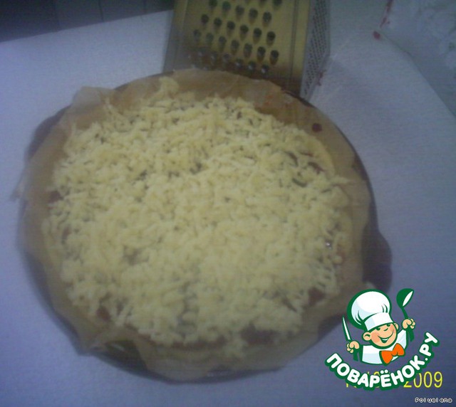 сверху потереть на терке тесто из холодильника - выпекать в хорошо прогретой до 180-200 гр.духовке.