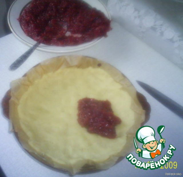 немного остывшее фруктовое пюре распределить аккуратно на тесте(у меня оказалось многовато)