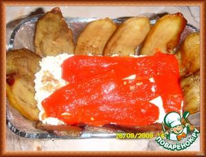 И выложить половину массы на баклажаны. Поверх творога слой красного перца,