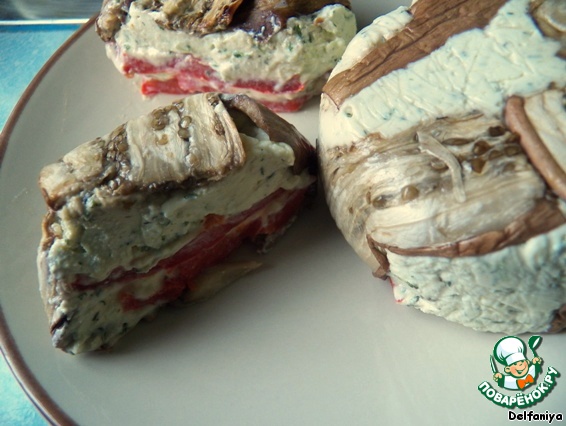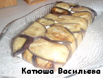 Ломтики баклажанов обмакиваем в оливковое масло и печём в горячей (180-200*С)духовке около 15 минут до мягкости, потом на решётку и под гриль на 5-7 минут.