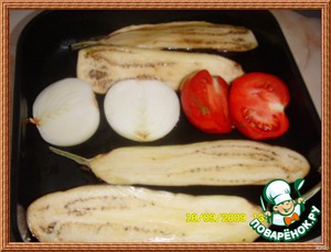 Лук, баклажаны, цуккини (их не было,обошлась)помидоры разрезать пополам, смазать маслом и запечь в духовке при 200 градусах 30 минут.