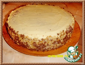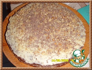 Каждый слой крема посыпать натёртым шоколадом и измельчёнными грецкими орехами. Второй корж идет от рецепта "Паланга"