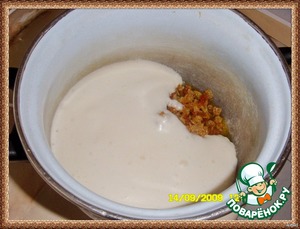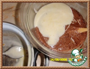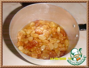 Изюм промыть, залить коньяком и дать постоять 30 минут. Коньяк слить и сохранить. Изюм мелко порубить. -