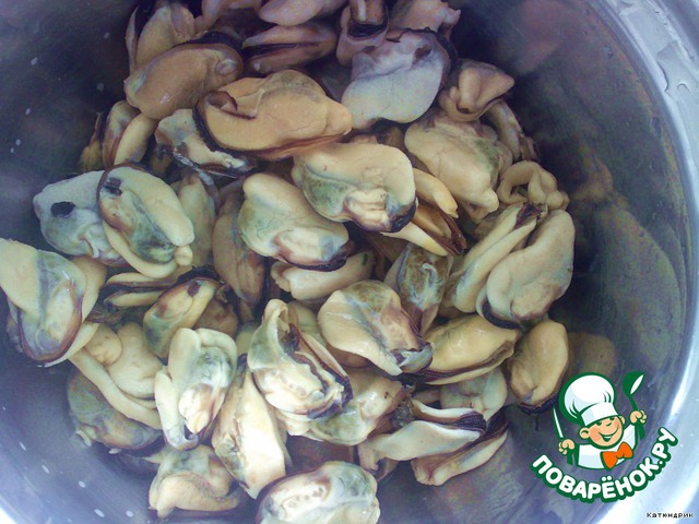 2. Готовим вкусную заправку, для этого нам необходимо: разморозить наши мидии и хорошенько промыть, удалить водоросли, если есть. -
