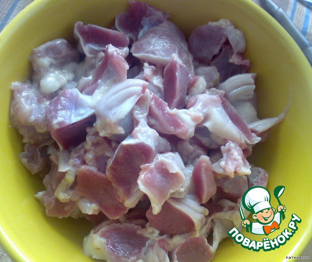 3. Куриные желудки промыть, удалить лишнее на них и нарезать полосочками.