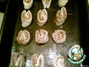 Режем рулет поперек кусочками по 2 см. Противень смазываем маслом, укладываем наши улитки не ближе друг к другу, чем на 2 см. Выпекаем в духовке при 180 градусах 15 минут.