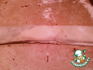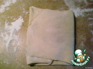 Посыпаем стол мукой, раскатываем тесто в прямоугольный пласт и складываем его втрое. Поворачиваем тесто на 90 градусов и повторяем данную процедуру.
