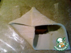 Берем растаявшее слоеное тесто. Я делала из половины пачки, т.е. 200г (можно взять и целую пачку, тогда соответственно увеличить и количество масла). Кладем кусок масла и заворачиваем тесто конвертом.