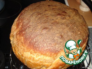 Срочно грею печь до 250°. Всовываю осторожно казан и выпекаю минут 10-15, Боже - он - не казан, хлеб! ещё больше поднялся! Как только верх поджарился и хлебушек схватился, я его вынула из казана, схватив за торчащие бумажные уши. Огонь уменьшила, через время верх накрыла, а бумагу сняла с краёв, чтоб со всех сторон пропёкся.