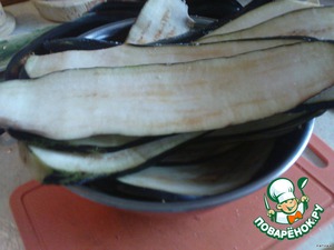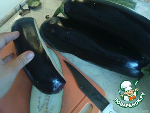 Моем и отрезаем, пардон, жопки:-D нашим баклажанам. После чего нарезаем их вдоль тонкими пластиночками (приблизительно 0,5 см толщиной. -