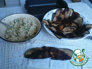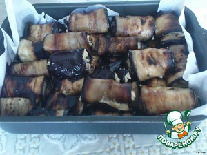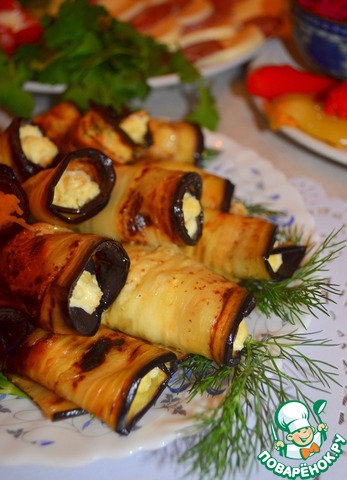Начинаем формировать закруточки. Мажем баклажанчик тонким слоем начинки и заворачиваем рулетиком -