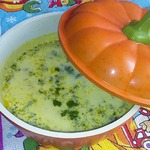 4. Тыкву вымойте, очистите от кожуры и нарежьте крупными кубиками. Положите в суп, варите 5 мин. и снимите с огня. Дайте немного остыть и затем измельчите в блендере.
