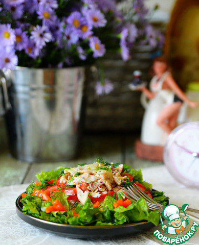 Салат готов. В журнале рекомендовали подавать его на салатных листьях.