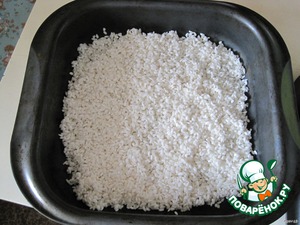 Подготовим рис. Промыть тщательно в холодной воде. Рис использую длиннозерный, как правило «золотистый», но сегодня был «Краснодарский», тоже хорошо получилось. И так рис у нас подготовлен, духовка нагрелась до 210 градусов, кура замаринована. Выкладываем рис в емкость для запекания. У меня из жидкокристалического полимера. В принципе это может быть любая жаропрочная посуда с крышкой, предназначенной для запекания. На рис наливаем кипятка ровно столько, чтобы накрыть рис, не более того.