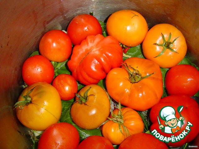 На дно кастрюли укладываем специи, сверху два слоя помидоров, затем опять специи и т. д.