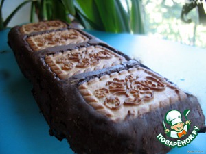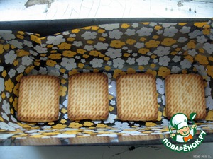 Простелить пленкой форму-кирпичик как для хлеба. На дно в линию положить печенюшки, оставляя небольшой просвет между ними (просто для красоты). -