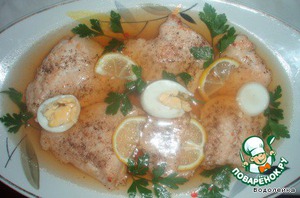 Выложить на блюдо и украсить вокруг по вашему желанию. Я положила дольки лимона, вареного яйца и зелень. -
