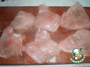 Куриное филе порезать на кусочки, отбить, поперчить, посолить (можно добавить любые приправы по вашему вкусу).