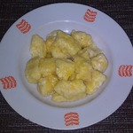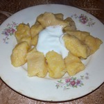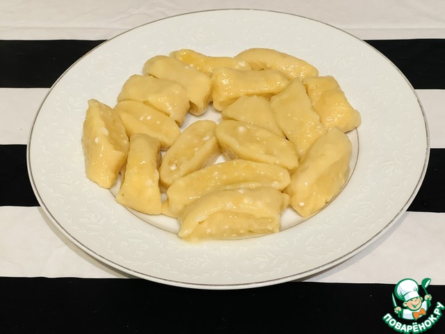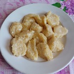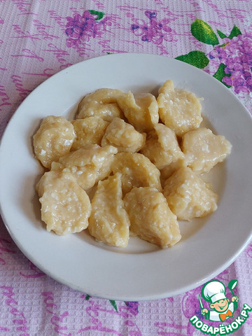 Всыпать муку, еще раз перемешать (если нужно, то подсыпать еще), тесто должно слегка замеситься, но не круто. Стол хорошо посыпать мукой, тесто поделить на 2 части, скатать в "колбаску", порезать на кусочки. Опускать в кипящую подсоленную воду, помешать чтобы не прилипли. Как только всплывут -дать покипеть еще немного.