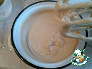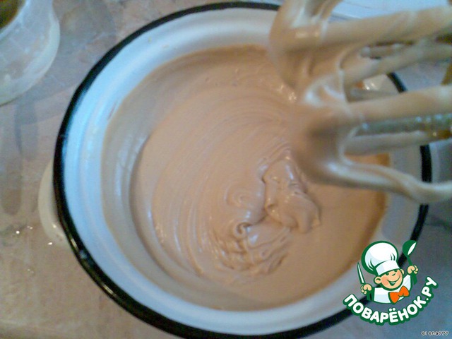 Пока печётся "корж" делаем крем: взбить масло сливочное и варёную сгущёнку до пышности.