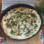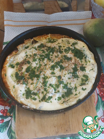 Яичную смесь из мисочки выливаем на сковороду, наводим таймер на 5 минут и жарим, накрыв крышкой. Когда таймер сработает, снимаем крышку.... проверяем конфорку. Включаем газ под сковородой и снова накрываем крышкой и наводим таймер на 5 минут.