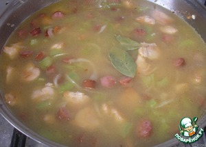 Заливаем куриным бульоном или водой. Добавляем лаврушку, перемешиваем, досаливаем, если надо. Доводим до кипения, убавляем огонь, накрываем крышкой. Готовим еще 20 минут.