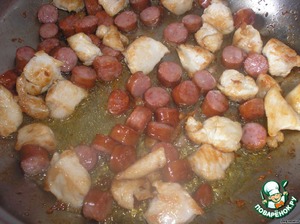 В большой и глубокой сковороде 5 минут обжариваем курицу. Затем к ней отправляем колбаски и жарим еще 3 минуты.