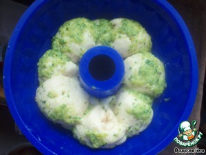 .... укладываем в смазанную маслом форму(форму можно взять любую) вроде как в шахматном порядке. Количество рядов может быть разное ( у меня их получилось два). Каждый слой тоже промазать нашей смесью.