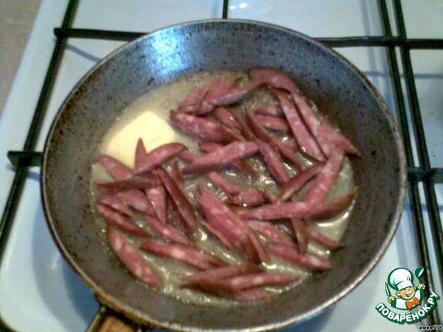 Пока маринуется лучок,режем колбаску (у меня была "Охотничья") соломкой и обжариваем в сливочном масле.