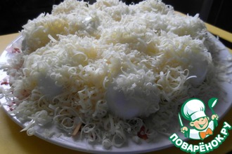 Сыр натереть на крупной тёрке (я натёрла домашний "Сливочный"), отложить в блюдце 6 ч.л. отдельно.