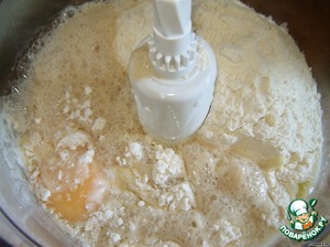 Влить в чашу для миксера сметану (можно наполовину с кефиром), добавить остальной сахар, соль, соду, яйцо и стакан муки с горкой.