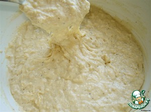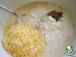 Вмешать в эту смесь остальную муку, сыр и перец.