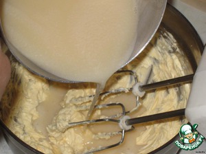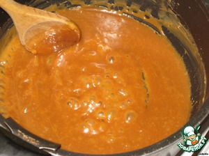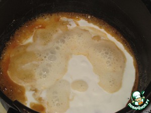 Затем влить 100 мл сметаны, все зашипит и карамель встанет колом, это нормально. Помешивая лопаткой подождать, пока сахарная карамель растворится в сметане и станет однородная масса с приятным светло-коричневым цветом и ирисковым запахом, на это у меня ушло примерно 7-10 минут. -