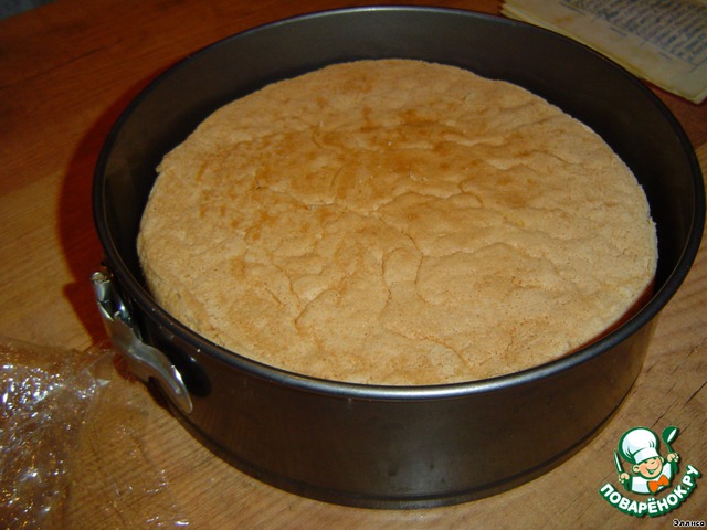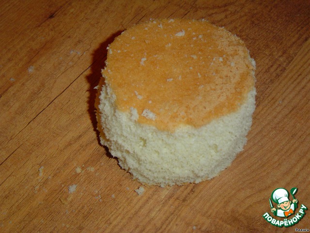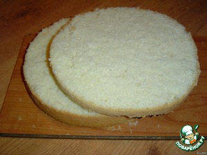 • Пока суфле застывает, разрезаем бисквит вдоль на два коржа и пропитываем их сиропом (вода, сахар, лимонный сок).