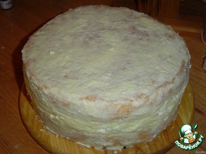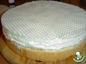 • Сверху накрываем вторым бисквитным коржом и смазываем его и бока кремом.