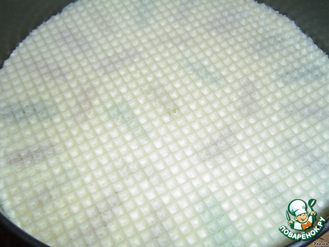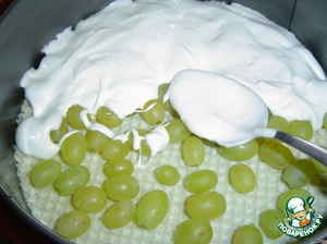 • Берем вафельные коржи, помещаем первый в разъемную форму и выкладываем на него виноград.